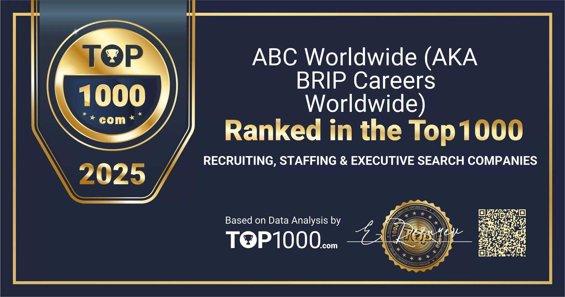 Earning a place among the Top 1000 Recruiting, Staffing & Executive Search Companies reflects strong visibility and trust from both employers and candidates. This recognition celebrates the sustained effort of ABC Worldwide (AKA BRIP Careers Worldwide) to support organisations with high-quality talent solutions and to guide professionals through key career moves.