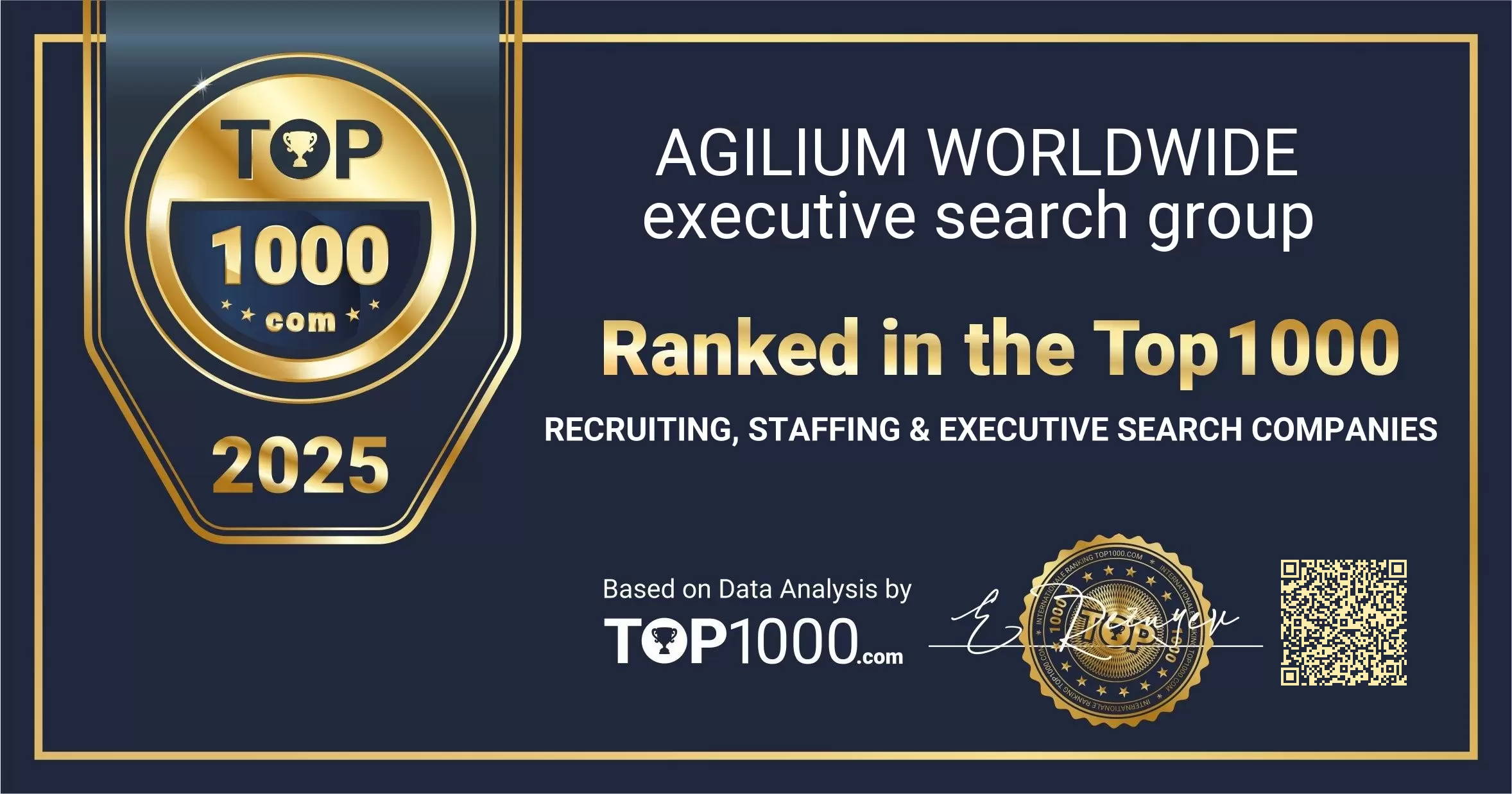 AGILIUM WORLDWIDE executive search group has been included in the Top 1000 Recruiting, Staffing & Executive Search Companies ranking. Use the options below to share this acknowledgement through your official channels.