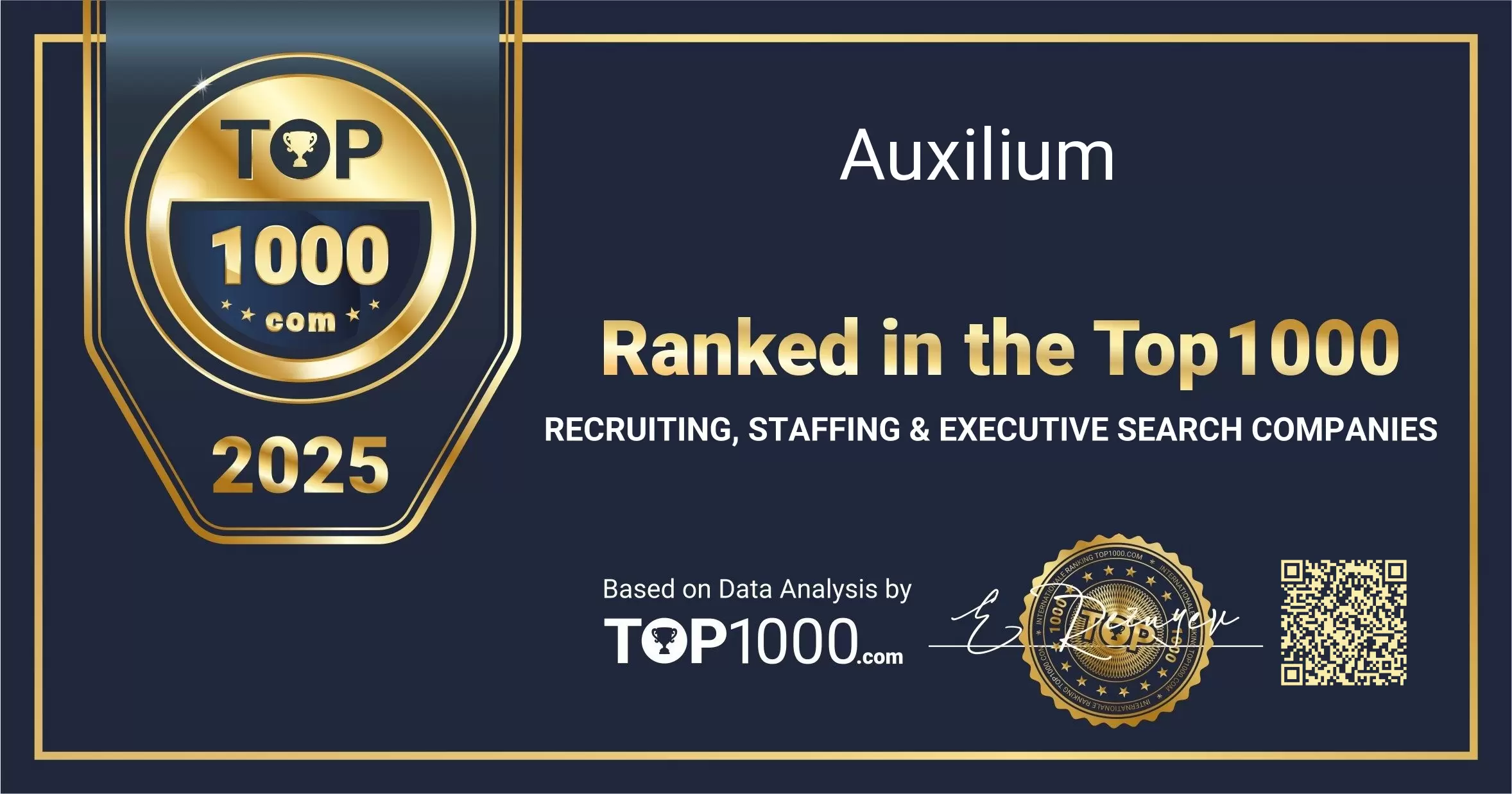 Earning a place among the Top 1000 Recruiting, Staffing & Executive Search Companies reflects strong visibility and trust from both employers and candidates. This recognition celebrates the sustained effort of Auxilium to support organisations with high-quality talent solutions and to guide professionals through key career moves.