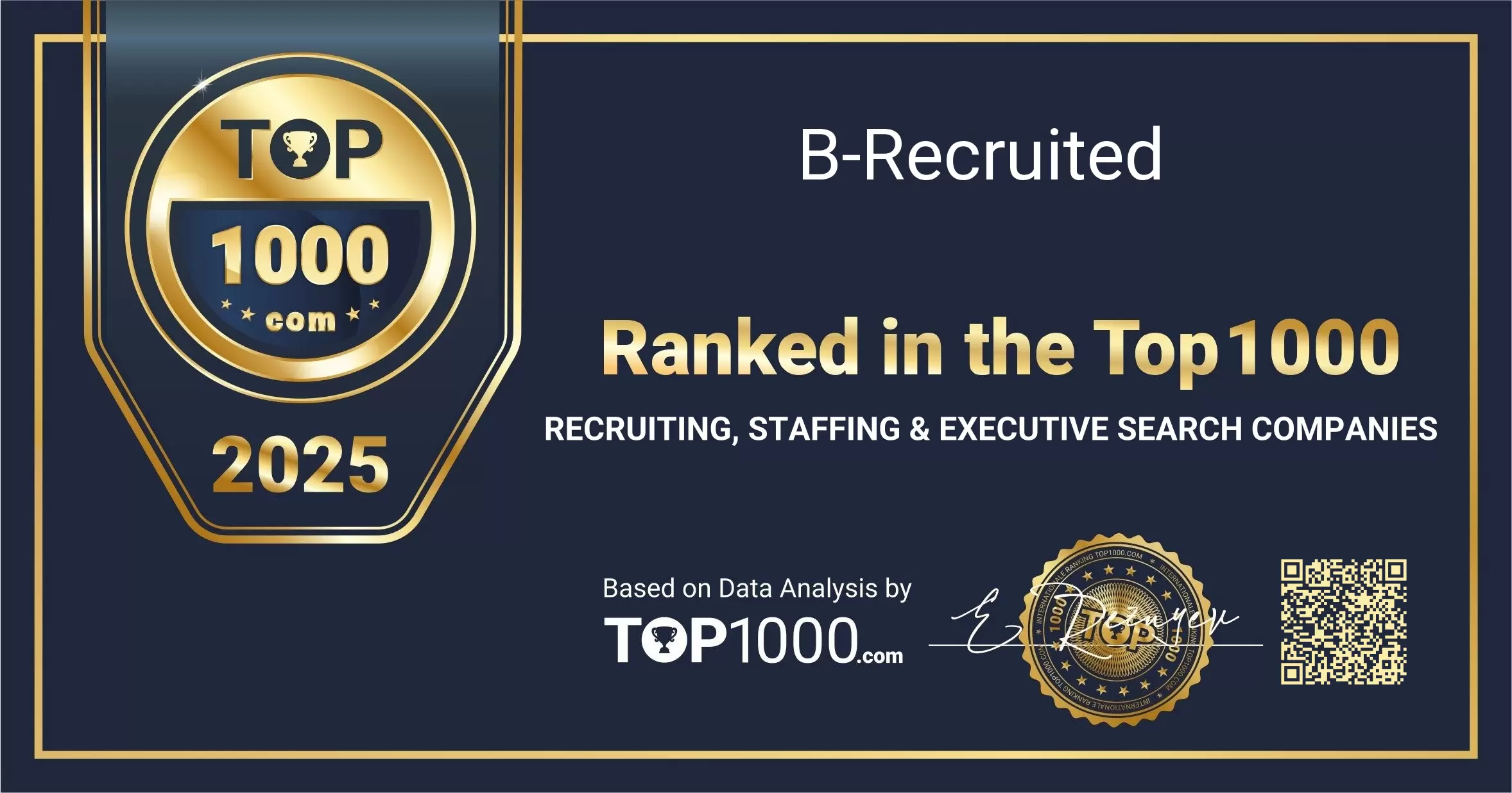 Earning a place among the Top 1000 Recruiting, Staffing & Executive Search Companies reflects strong visibility and trust from both employers and candidates. This recognition celebrates the sustained effort of B-Recruited to support organisations with high-quality talent solutions and to guide professionals through key career moves.