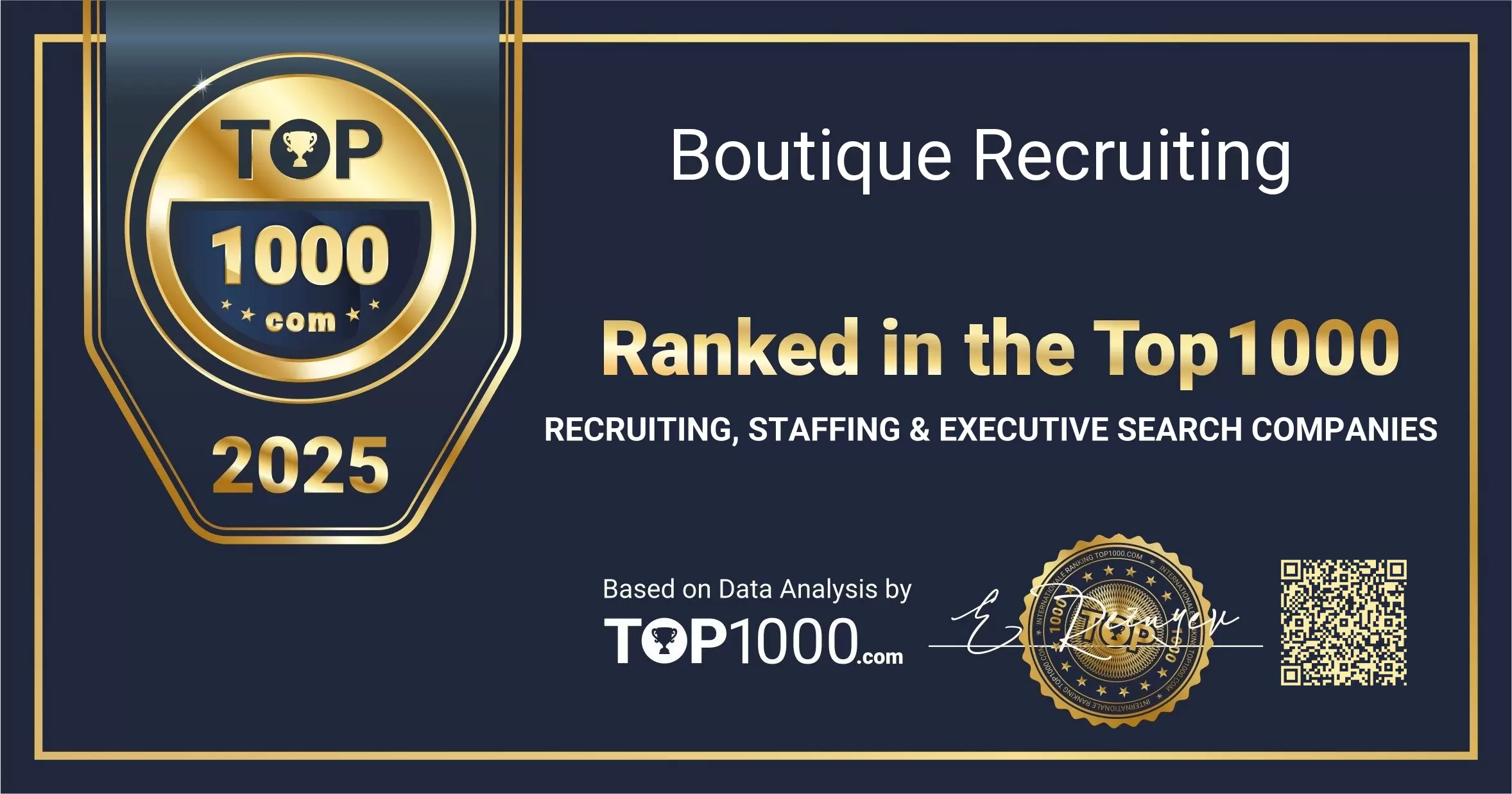 Earning a place among the Top 1000 Recruiting, Staffing & Executive Search Companies reflects strong visibility and trust from both employers and candidates. This recognition celebrates the sustained effort of Boutique Recruiting to support organisations with high-quality talent solutions and to guide professionals through key career moves.