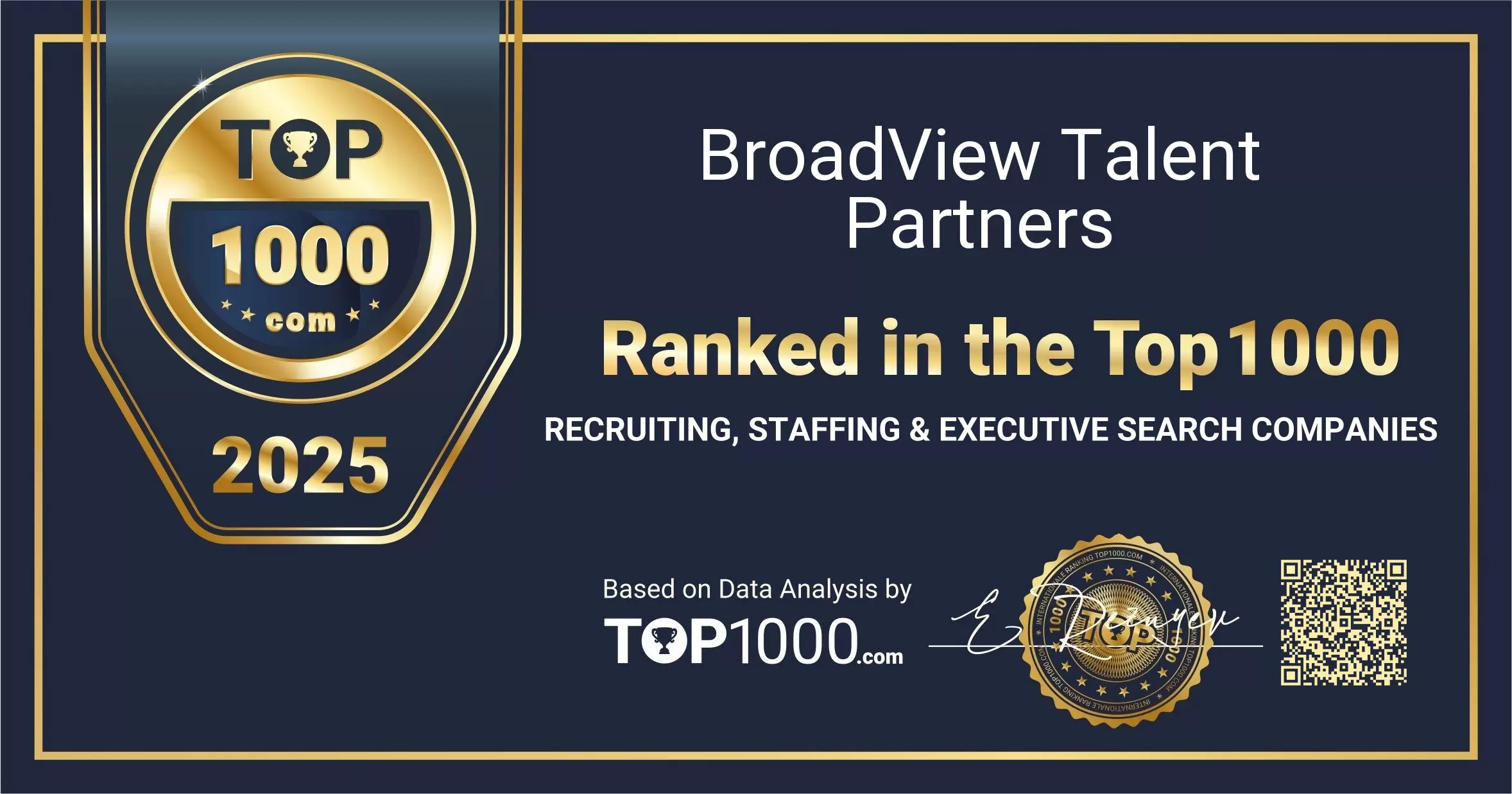 BroadView Talent Partners has been included in the Top 1000 Recruiting, Staffing & Executive Search Companies ranking. Use the options below to share this acknowledgement through your official channels.