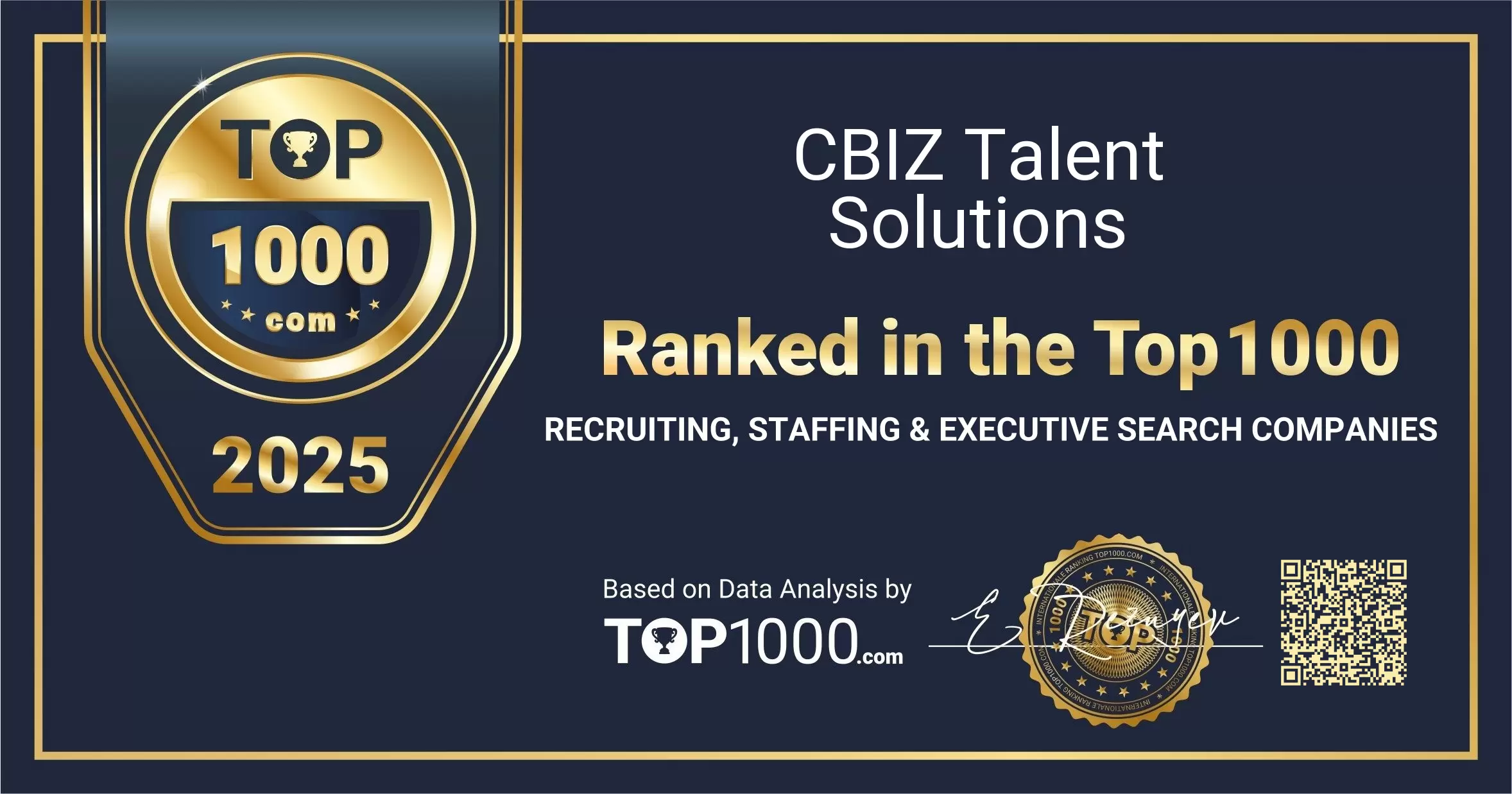 CBIZ Talent Solutions has been included in the Top 1000 Recruiting, Staffing & Executive Search Companies ranking. Use the options below to share this acknowledgement through your official channels.