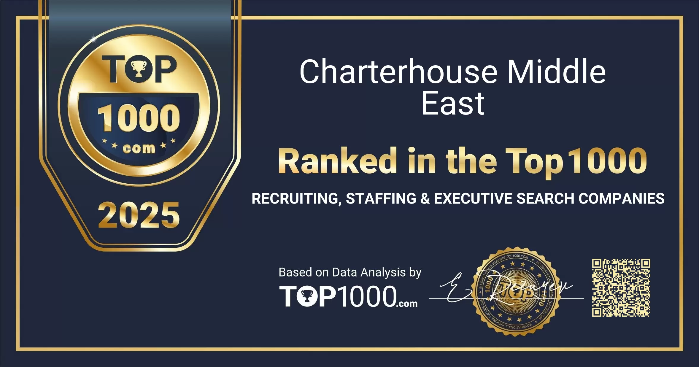 Earning a place among the Top 1000 Recruiting, Staffing & Executive Search Companies reflects strong visibility and trust from both employers and candidates. This recognition celebrates the sustained effort of Charterhouse Middle East to support organisations with high-quality talent solutions and to guide professionals through key career moves.