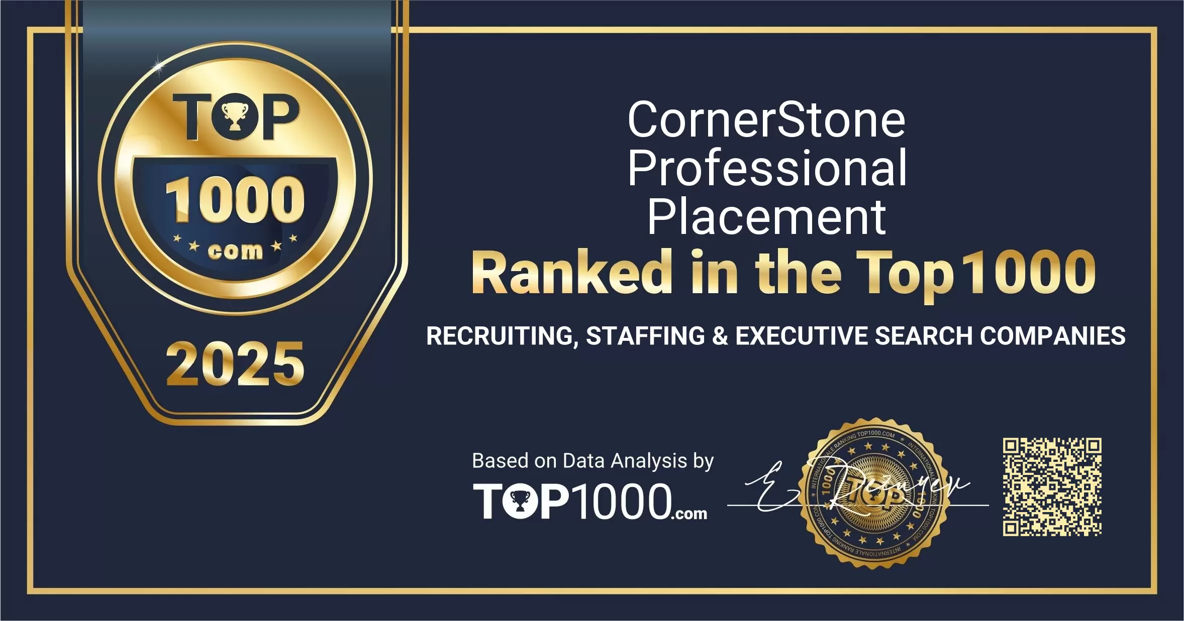 Earning a place among the Top 1000 Recruiting, Staffing & Executive Search Companies reflects strong visibility and trust from both employers and candidates. This recognition celebrates the sustained effort of CornerStone Professional Placement to support organisations with high-quality talent solutions and to guide professionals through key career moves.