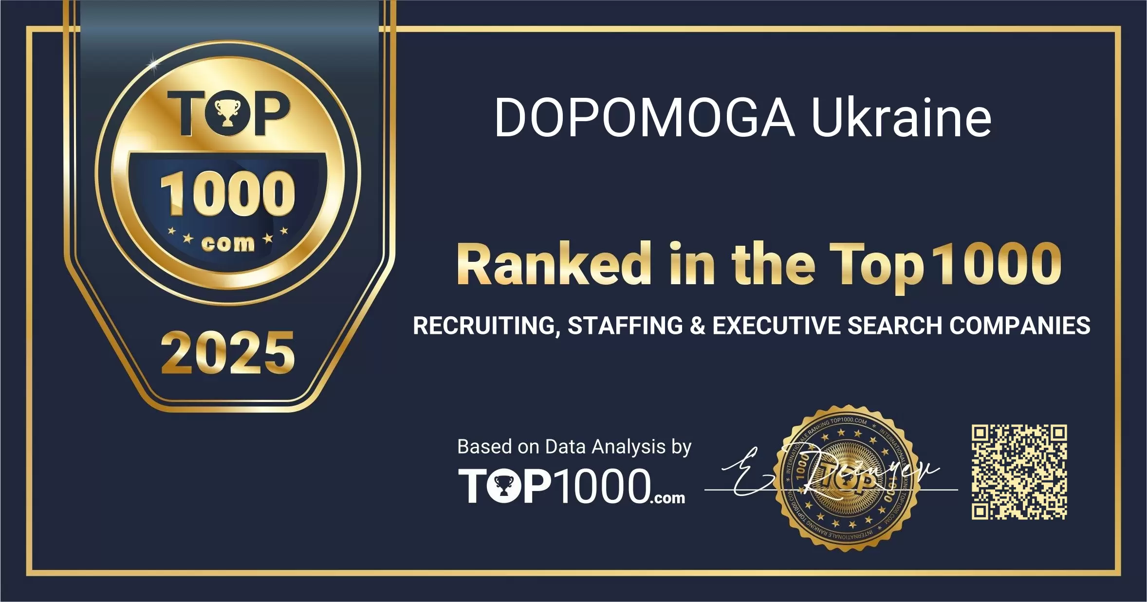 Earning a place among the Top 1000 Recruiting, Staffing & Executive Search Companies reflects strong visibility and trust from both employers and candidates. This recognition celebrates the sustained effort of DOPOMOGA Ukraine to support organisations with high-quality talent solutions and to guide professionals through key career moves.