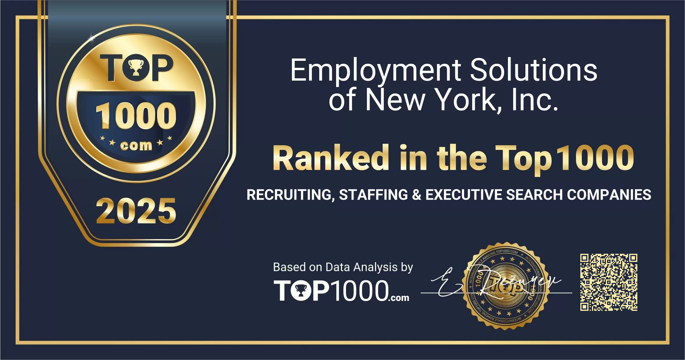 Employment Solutions of New York, Inc. has been included in the Top 1000 Recruiting, Staffing & Executive Search Companies ranking. Use the options below to share this acknowledgement through your official channels.