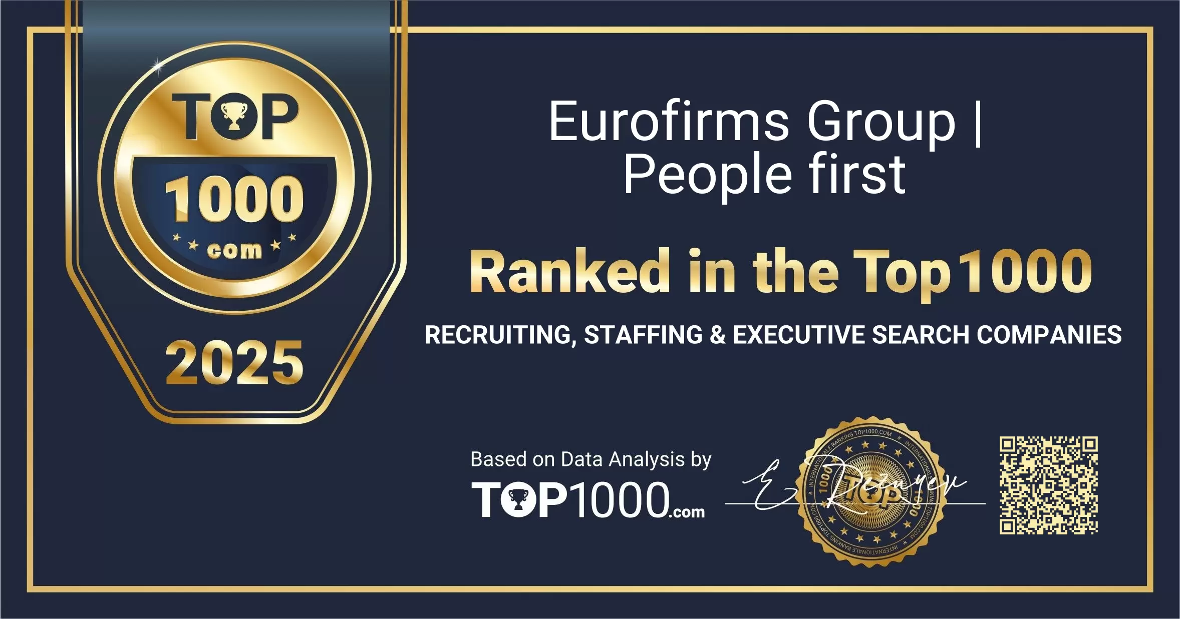 Earning a place among the Top 1000 Recruiting, Staffing & Executive Search Companies reflects strong visibility and trust from both employers and candidates. This recognition celebrates the sustained effort of Eurofirms Group | People first to support organisations with high-quality talent solutions and to guide professionals through key career moves.