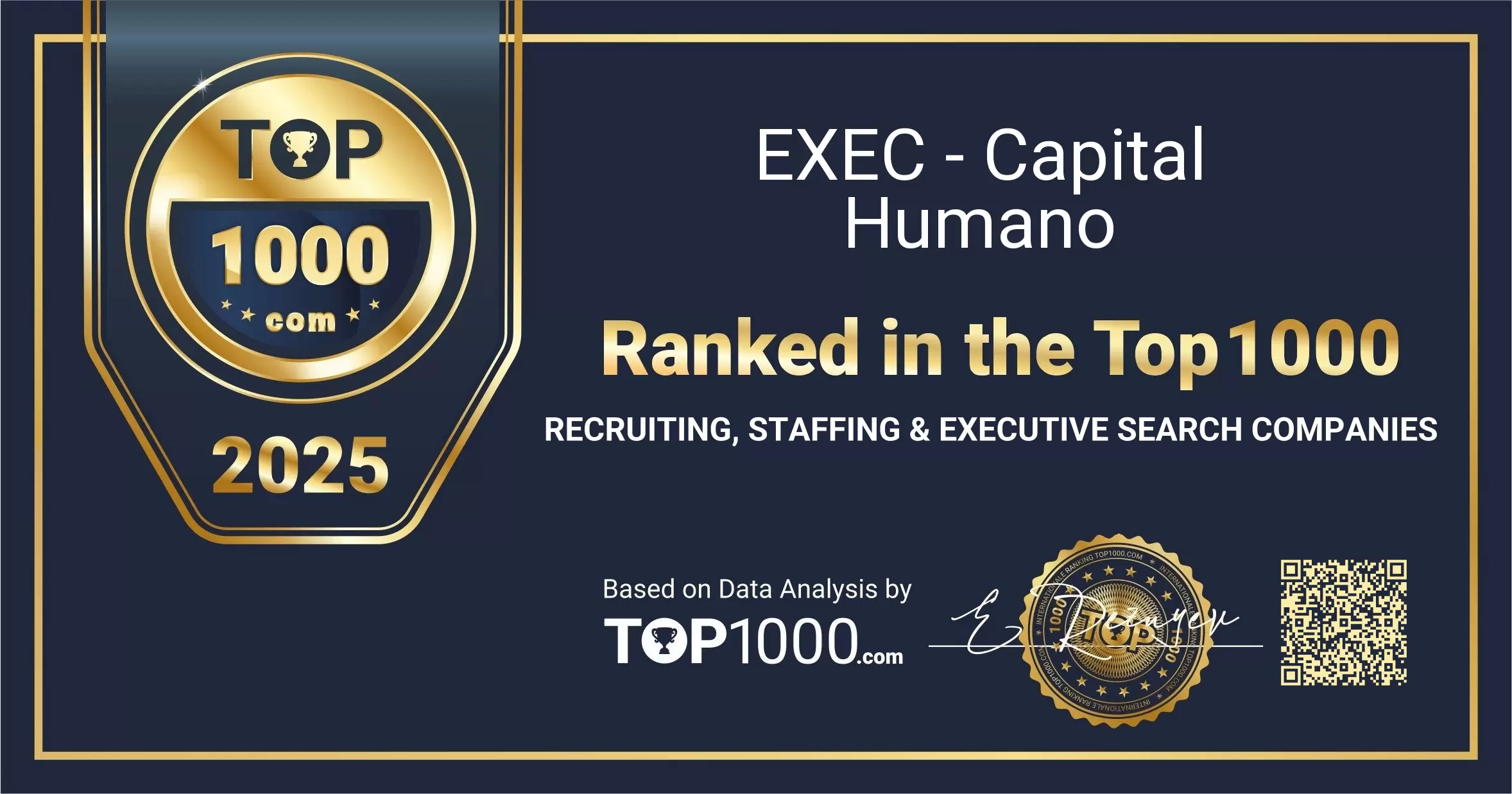 Earning a place among the Top 1000 Recruiting, Staffing & Executive Search Companies reflects strong visibility and trust from both employers and candidates. This recognition celebrates the sustained effort of EXEC - Capital Humano to support organisations with high-quality talent solutions and to guide professionals through key career moves.