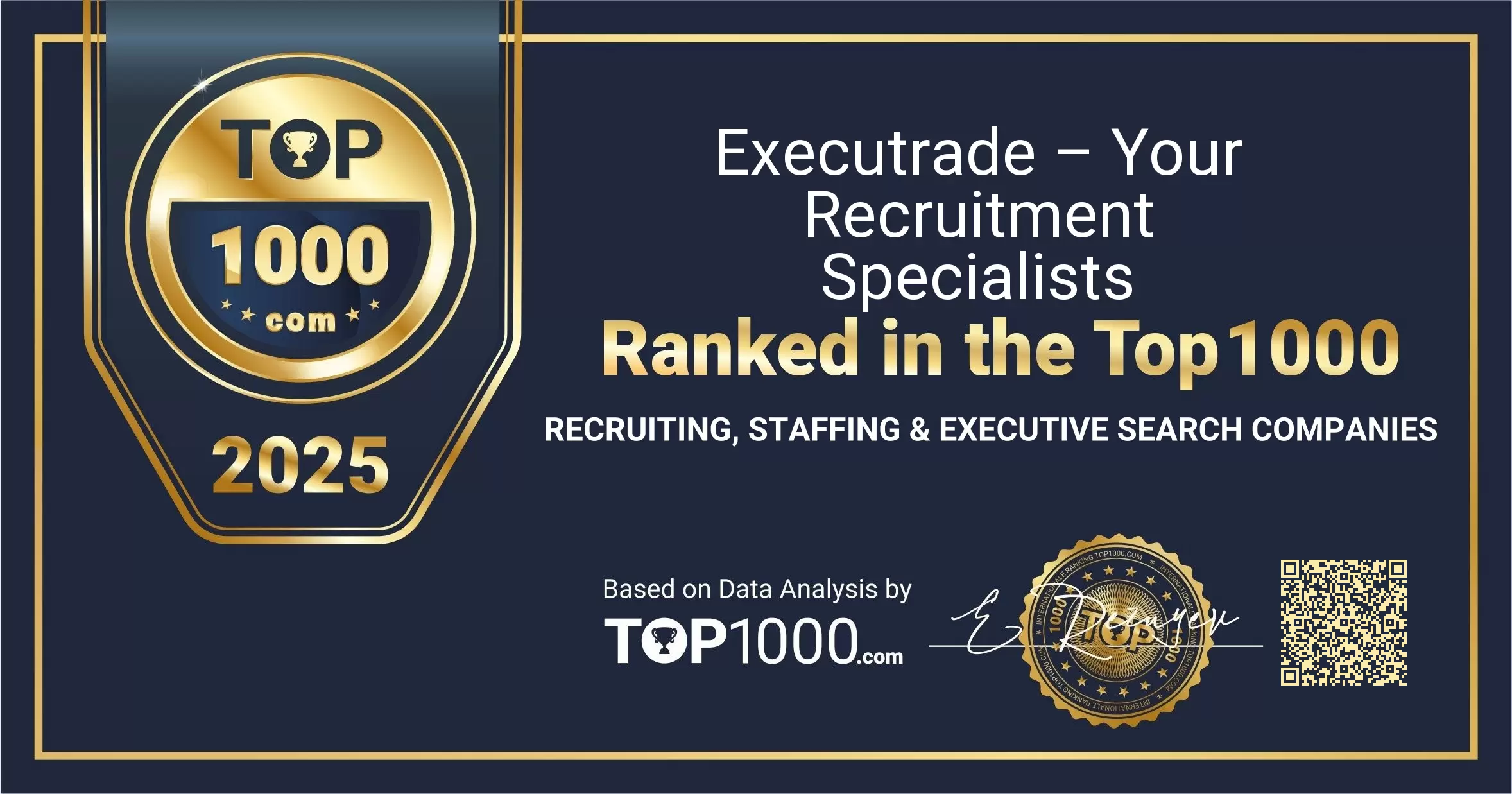 Earning a place among the Top 1000 Recruiting, Staffing & Executive Search Companies reflects strong visibility and trust from both employers and candidates. This recognition celebrates the sustained effort of Executrade – Your Recruitment Specialists to support organisations with high-quality talent solutions and to guide professionals through key career moves.