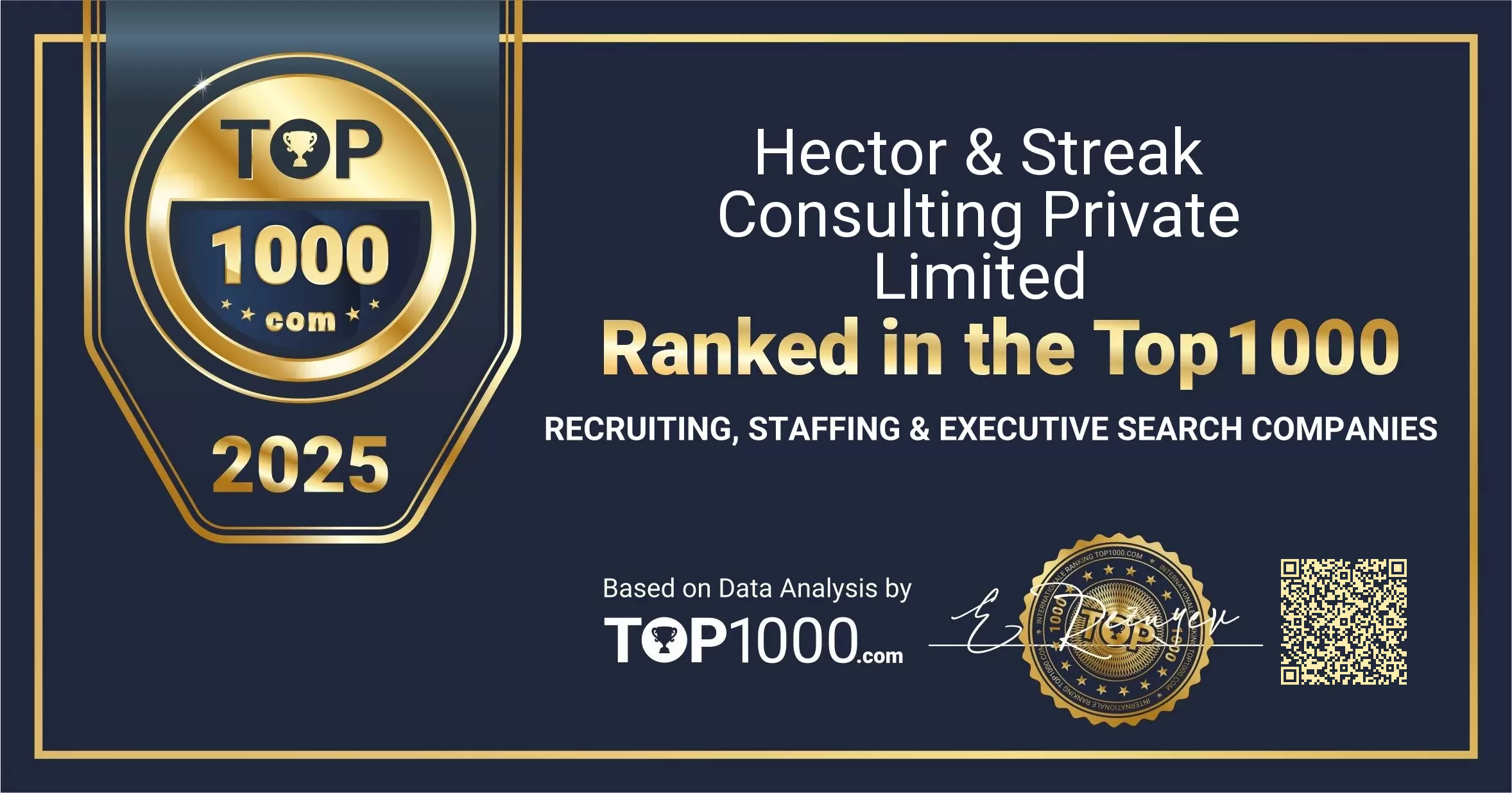 Earning a place among the Top 1000 Recruiting, Staffing & Executive Search Companies reflects strong visibility and trust from both employers and candidates. This recognition celebrates the sustained effort of Hector & Streak Consulting Private Limited to support organisations with high-quality talent solutions and to guide professionals through key career moves.