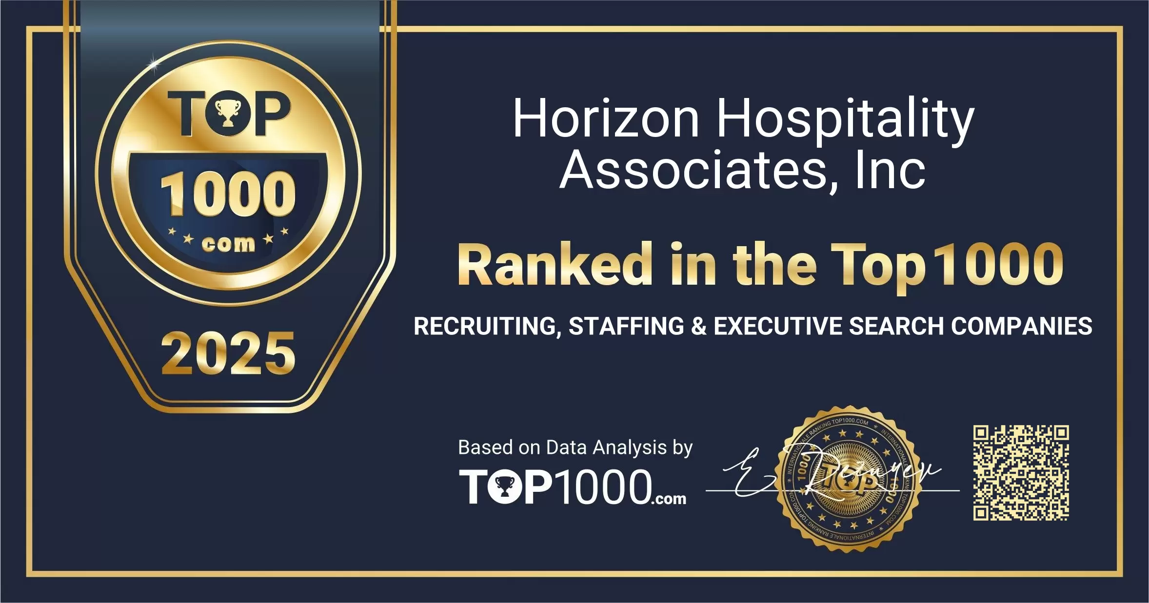 Earning a place among the Top 1000 Recruiting, Staffing & Executive Search Companies reflects strong visibility and trust from both employers and candidates. This recognition celebrates the sustained effort of Horizon Hospitality Associates, Inc to support organisations with high-quality talent solutions and to guide professionals through key career moves.
