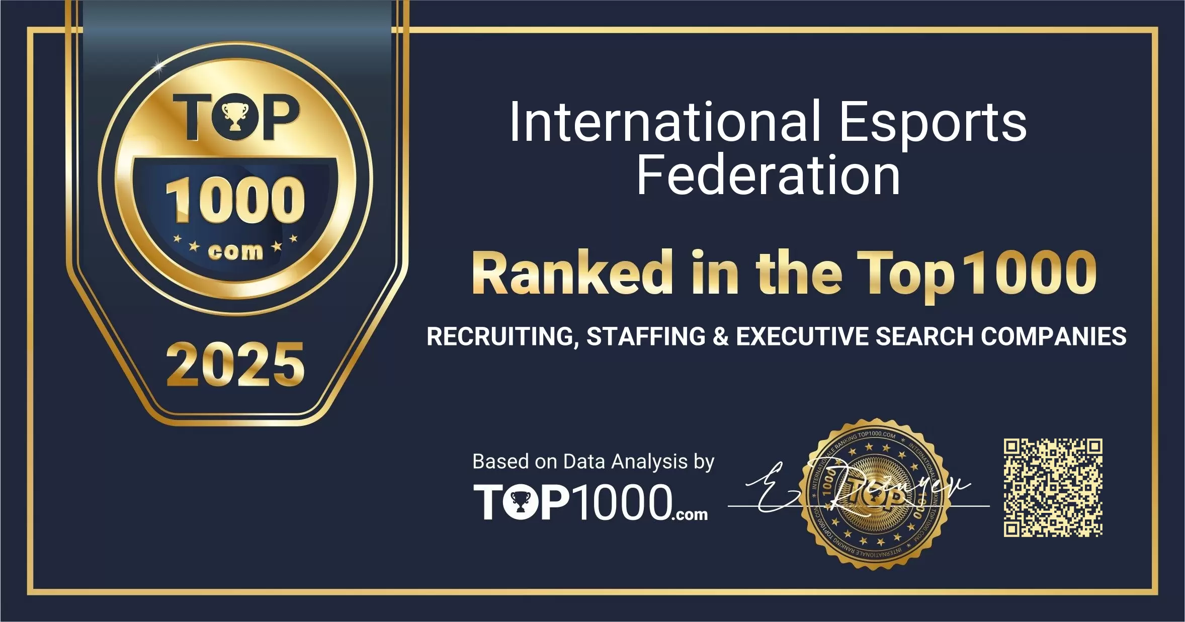 International Esports Federation has been included in the Top 1000 Recruiting, Staffing & Executive Search Companies ranking. Use the options below to share this acknowledgement through your official channels.