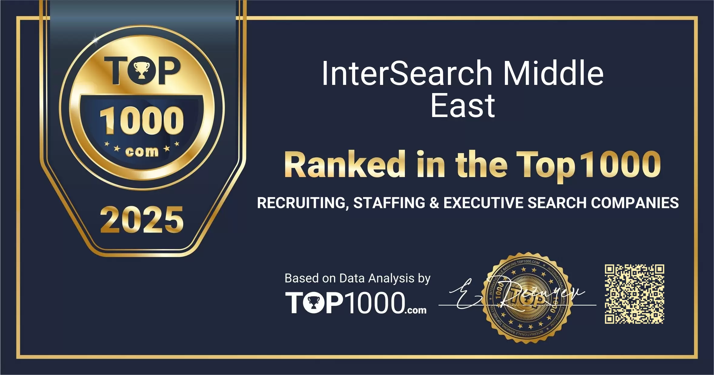 Earning a place among the Top 1000 Recruiting, Staffing & Executive Search Companies reflects strong visibility and trust from both employers and candidates. This recognition celebrates the sustained effort of InterSearch Middle East to support organisations with high-quality talent solutions and to guide professionals through key career moves.