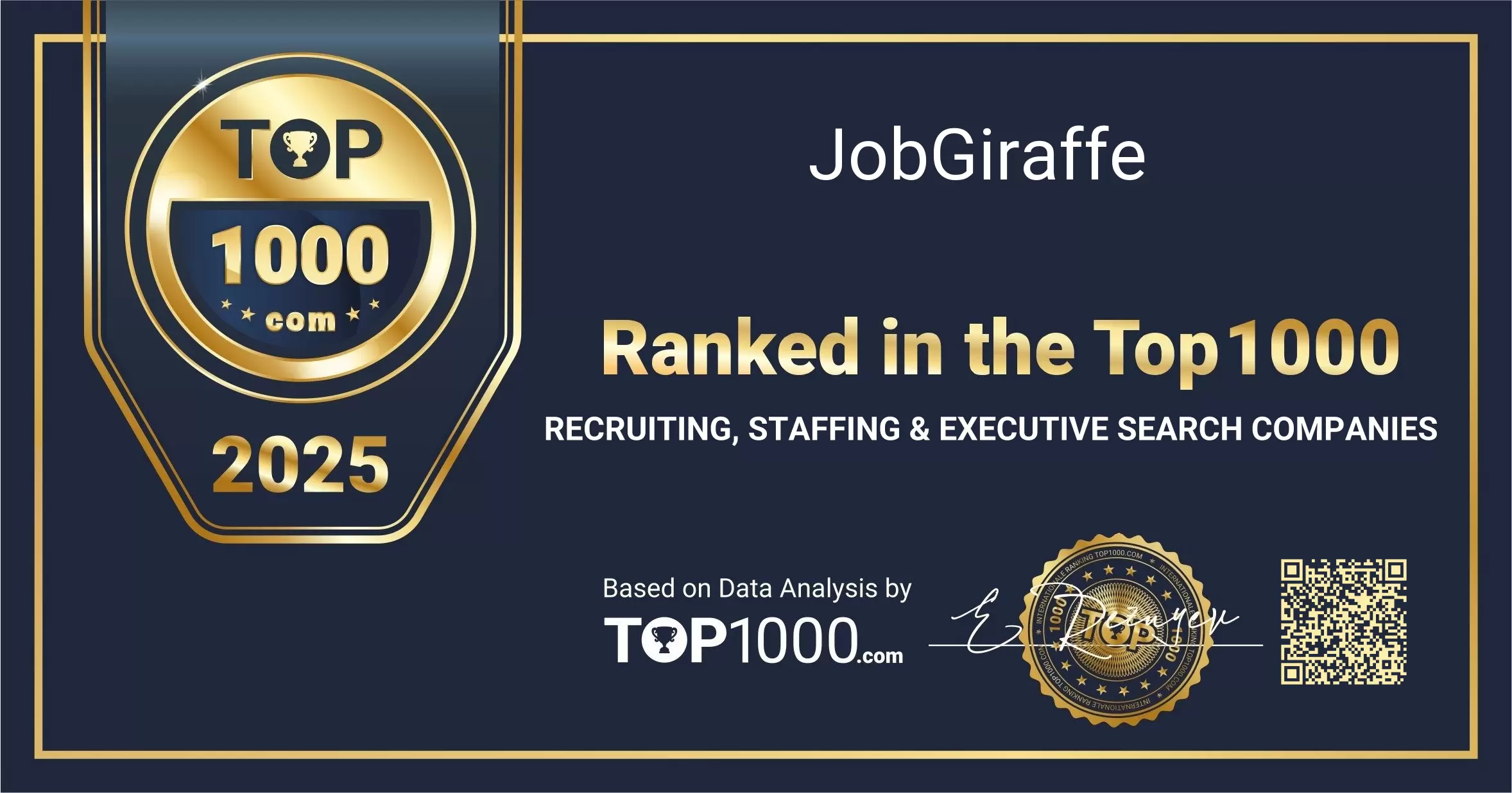 Earning a place among the Top 1000 Recruiting, Staffing & Executive Search Companies reflects strong visibility and trust from both employers and candidates. This recognition celebrates the sustained effort of JobGiraffe to support organisations with high-quality talent solutions and to guide professionals through key career moves.