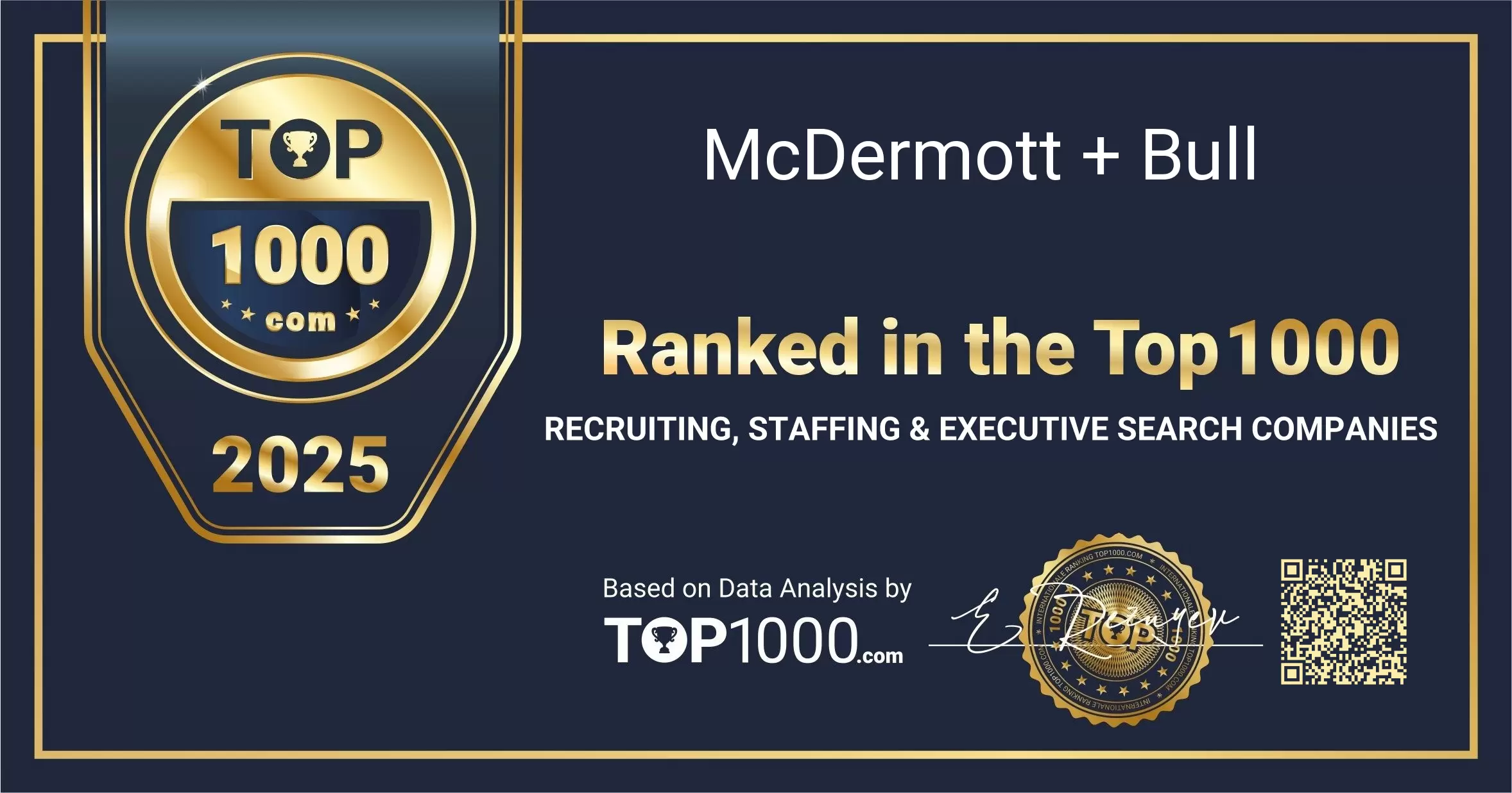 Earning a place among the Top 1000 Recruiting, Staffing & Executive Search Companies reflects strong visibility and trust from both employers and candidates. This recognition celebrates the sustained effort of McDermott + Bull to support organisations with high-quality talent solutions and to guide professionals through key career moves.