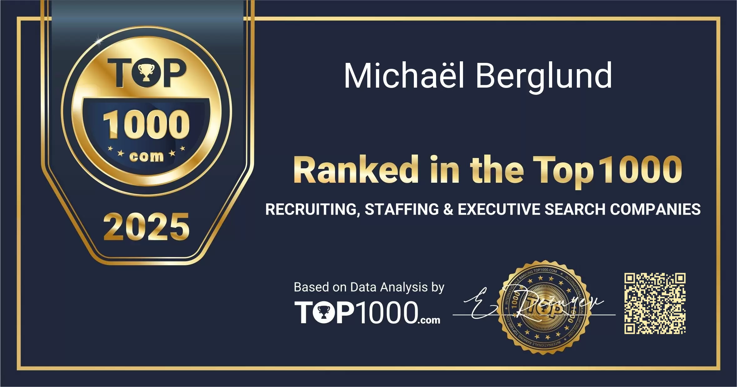 Earning a place among the Top 1000 Recruiting, Staffing & Executive Search Companies reflects strong visibility and trust from both employers and candidates. This recognition celebrates the sustained effort of Michaël Berglund to support organisations with high-quality talent solutions and to guide professionals through key career moves.