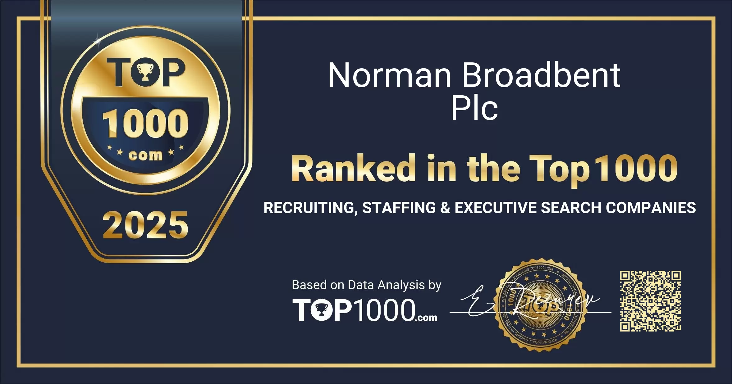 Earning a place among the Top 1000 Recruiting, Staffing & Executive Search Companies reflects strong visibility and trust from both employers and candidates. This recognition celebrates the sustained effort of Norman Broadbent Plc to support organisations with high-quality talent solutions and to guide professionals through key career moves.