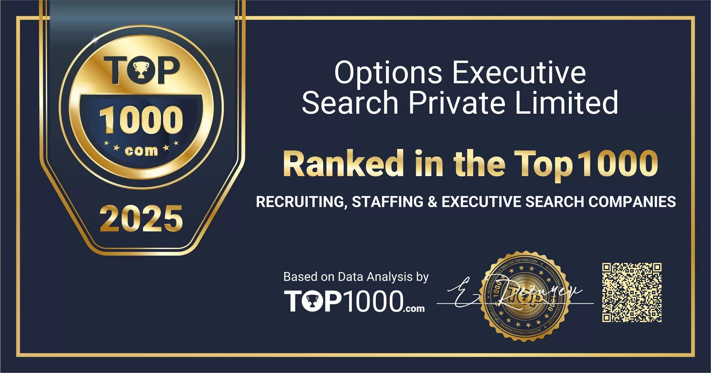 Earning a place among the Top 1000 Recruiting, Staffing & Executive Search Companies reflects strong visibility and trust from both employers and candidates. This recognition celebrates the sustained effort of Options Executive Search Private Limited to support organisations with high-quality talent solutions and to guide professionals through key career moves.