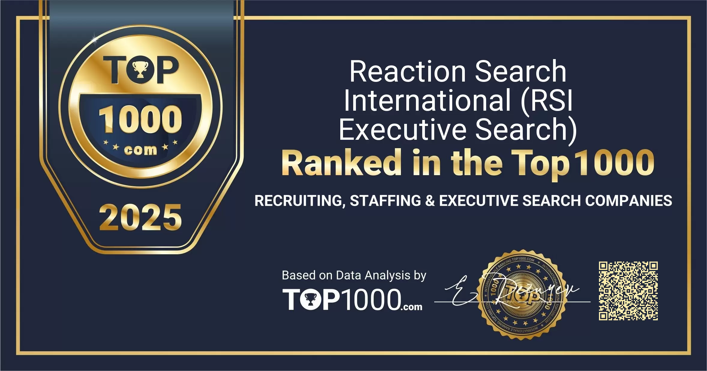 Reaction Search International (RSI Executive Search) has been included in the Top 1000 Recruiting, Staffing & Executive Search Companies ranking. Use the options below to share this acknowledgement through your official channels.