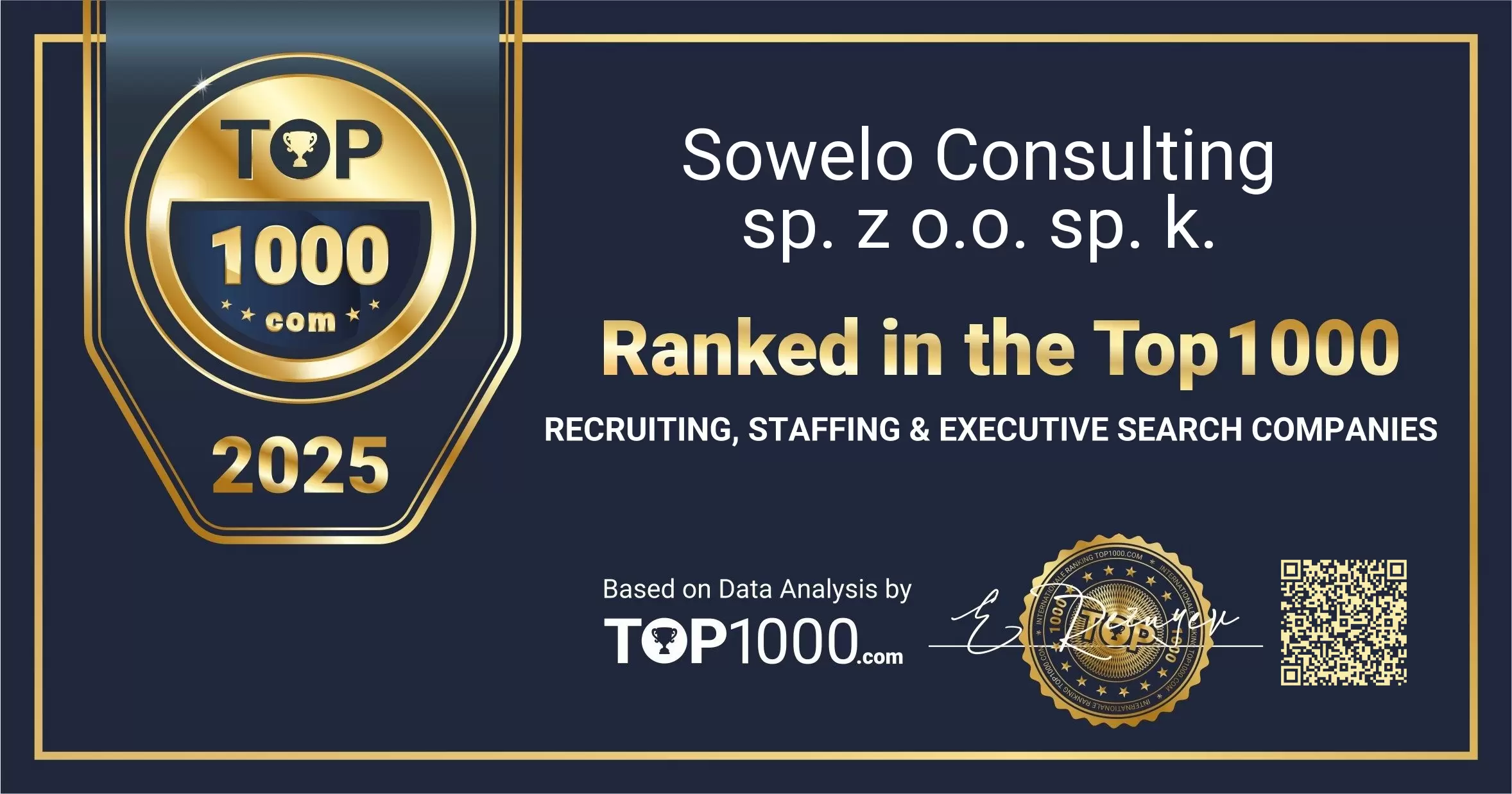 Earning a place among the Top 1000 Recruiting, Staffing & Executive Search Companies reflects strong visibility and trust from both employers and candidates. This recognition celebrates the sustained effort of Sowelo Consulting sp. z o.o. sp. k. to support organisations with high-quality talent solutions and to guide professionals through key career moves.