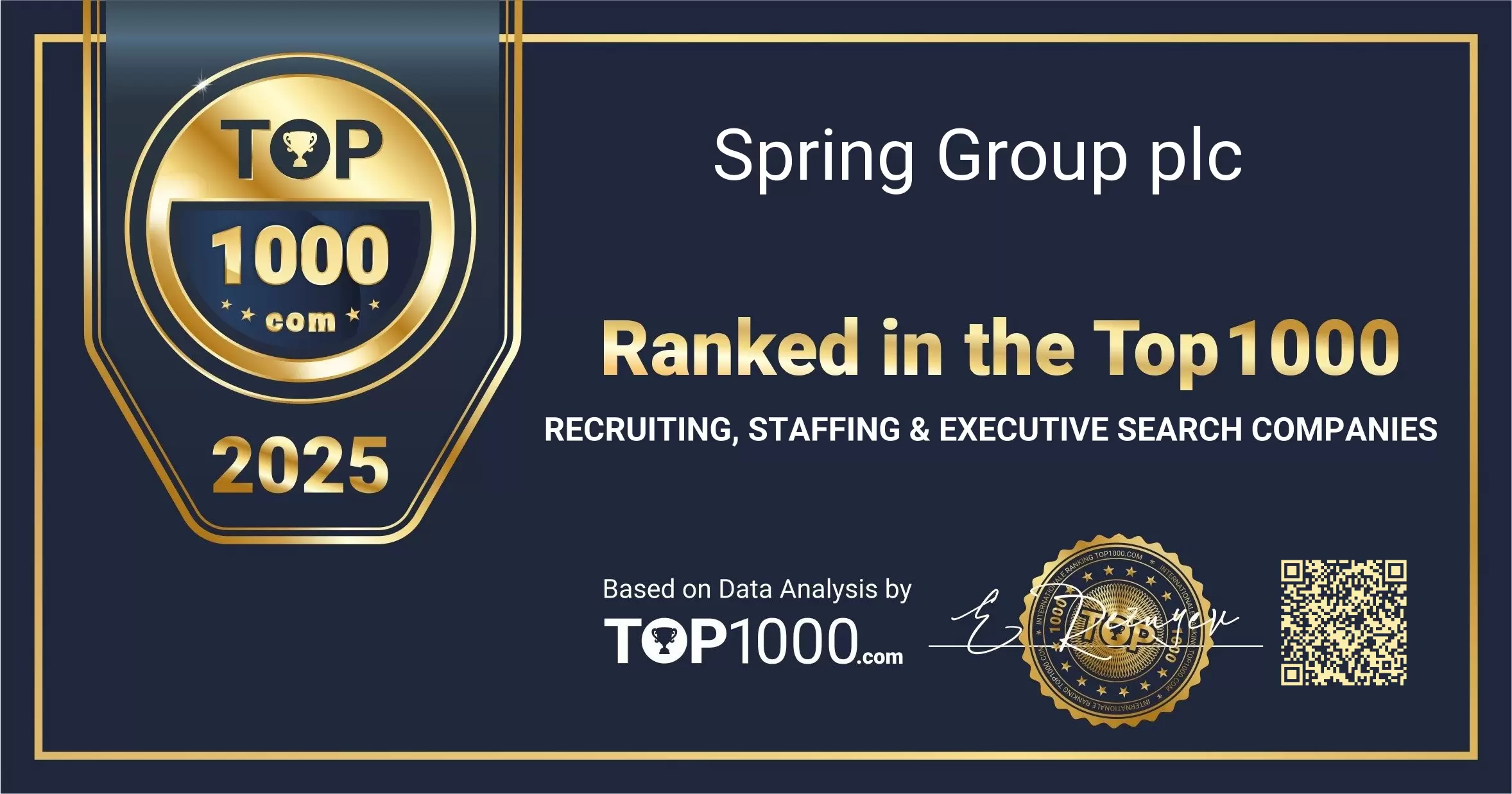 Earning a place among the Top 1000 Recruiting, Staffing & Executive Search Companies reflects strong visibility and trust from both employers and candidates. This recognition celebrates the sustained effort of Spring Group plc to support organisations with high-quality talent solutions and to guide professionals through key career moves.