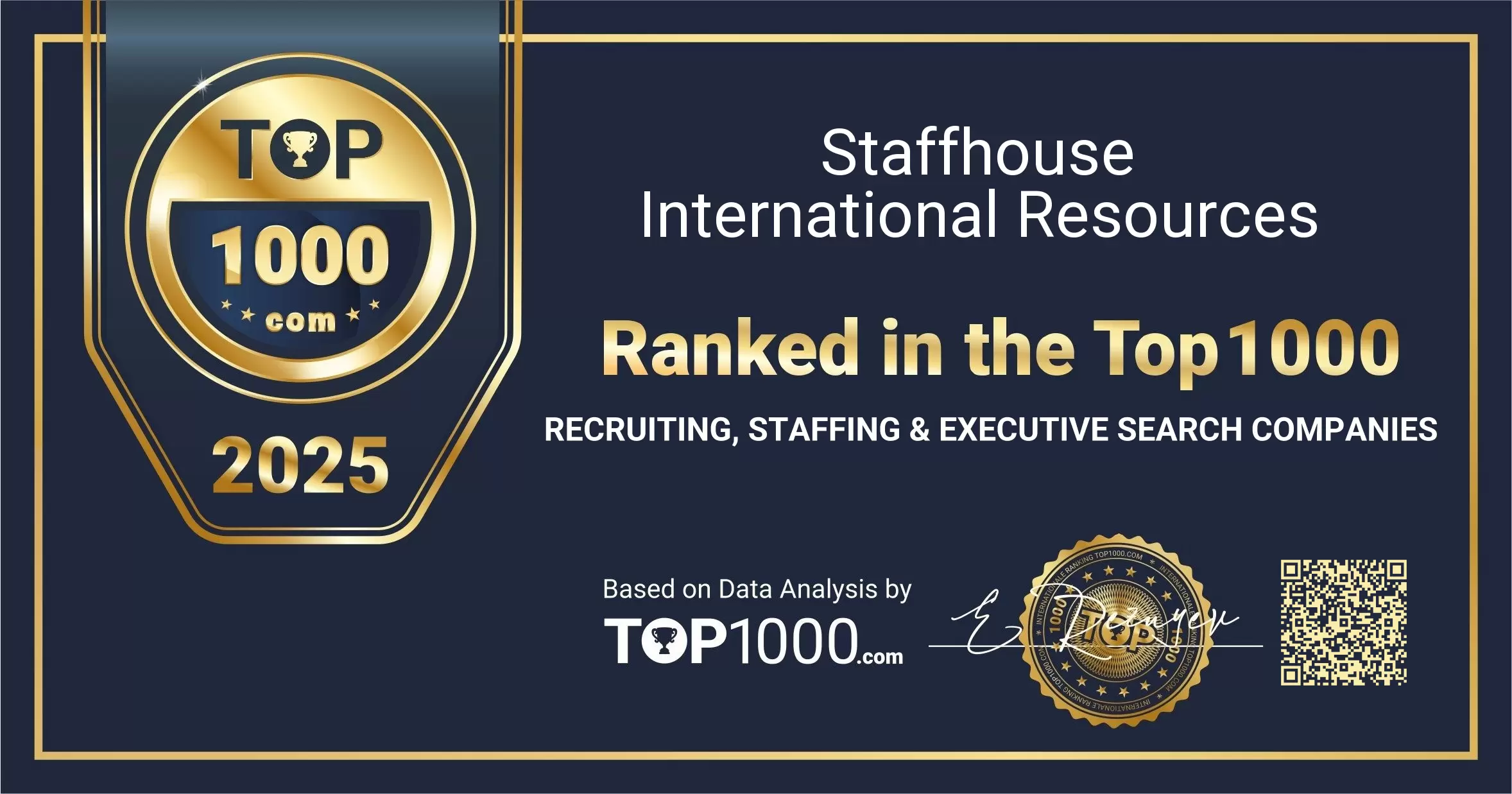 Earning a place among the Top 1000 Recruiting, Staffing & Executive Search Companies reflects strong visibility and trust from both employers and candidates. This recognition celebrates the sustained effort of Staffhouse International Resources to support organisations with high-quality talent solutions and to guide professionals through key career moves.