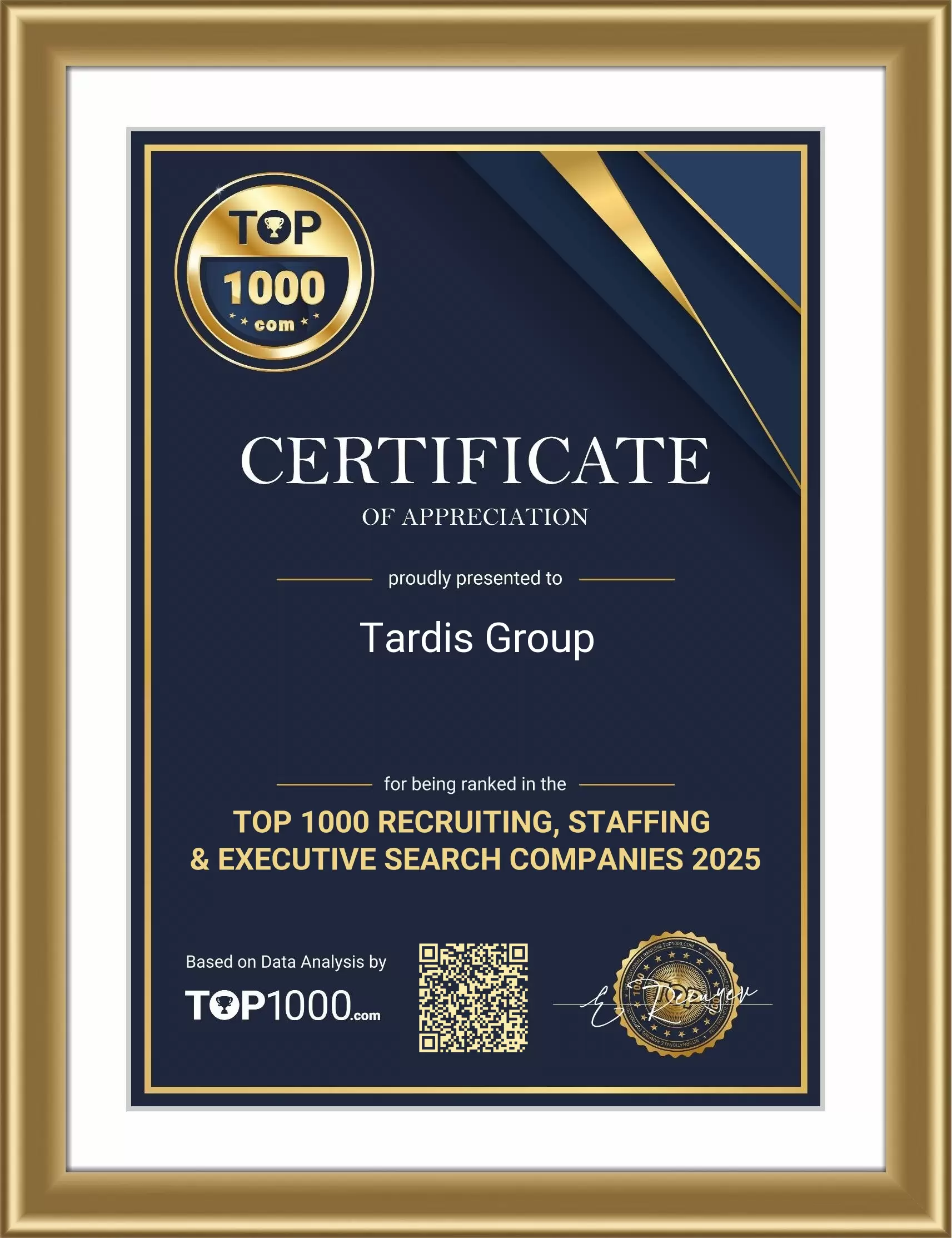 Earning a place among the Top 1000 Recruiting, Staffing & Executive Search Companies reflects strong visibility and trust from both employers and candidates. This recognition celebrates the sustained effort of Tardis Group to support organisations with high-quality talent solutions and to guide professionals through key career moves.