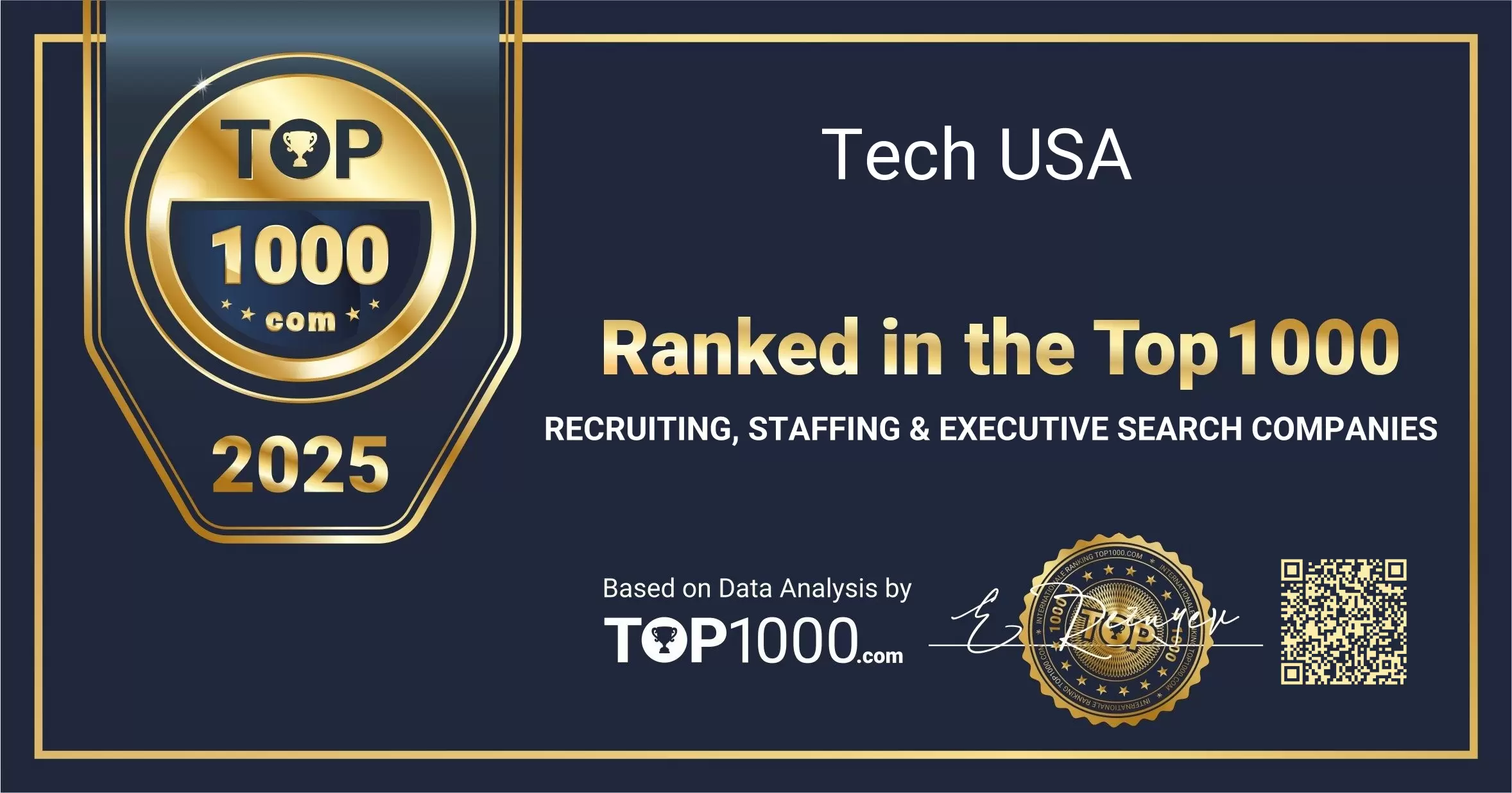 Earning a place among the Top 1000 Recruiting, Staffing & Executive Search Companies reflects strong visibility and trust from both employers and candidates. This recognition celebrates the sustained effort of Tech USA to support organisations with high-quality talent solutions and to guide professionals through key career moves.