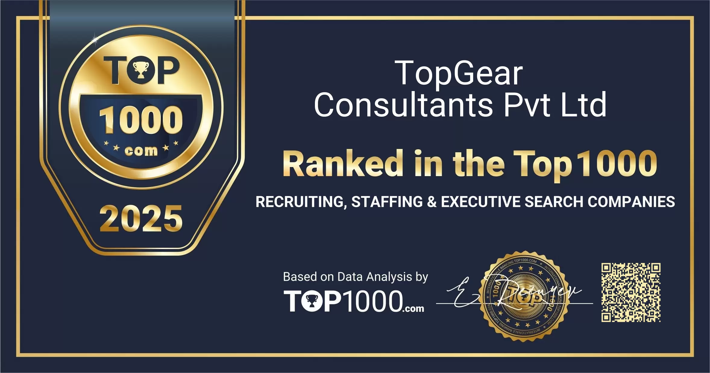 Earning a place among the Top 1000 Recruiting, Staffing & Executive Search Companies reflects strong visibility and trust from both employers and candidates. This recognition celebrates the sustained effort of TopGear Consultants Pvt Ltd to support organisations with high-quality talent solutions and to guide professionals through key career moves.