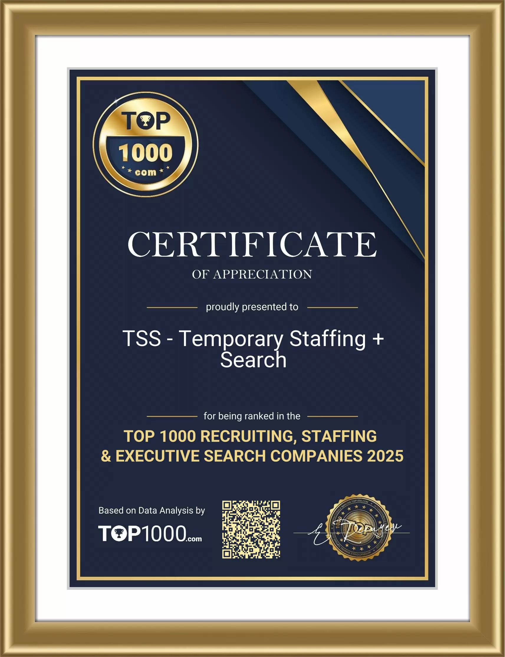 Earning a place among the Top 1000 Recruiting, Staffing & Executive Search Companies reflects strong visibility and trust from both employers and candidates. This recognition celebrates the sustained effort of TSS - Temporary Staffing + Search to support organisations with high-quality talent solutions and to guide professionals through key career moves.