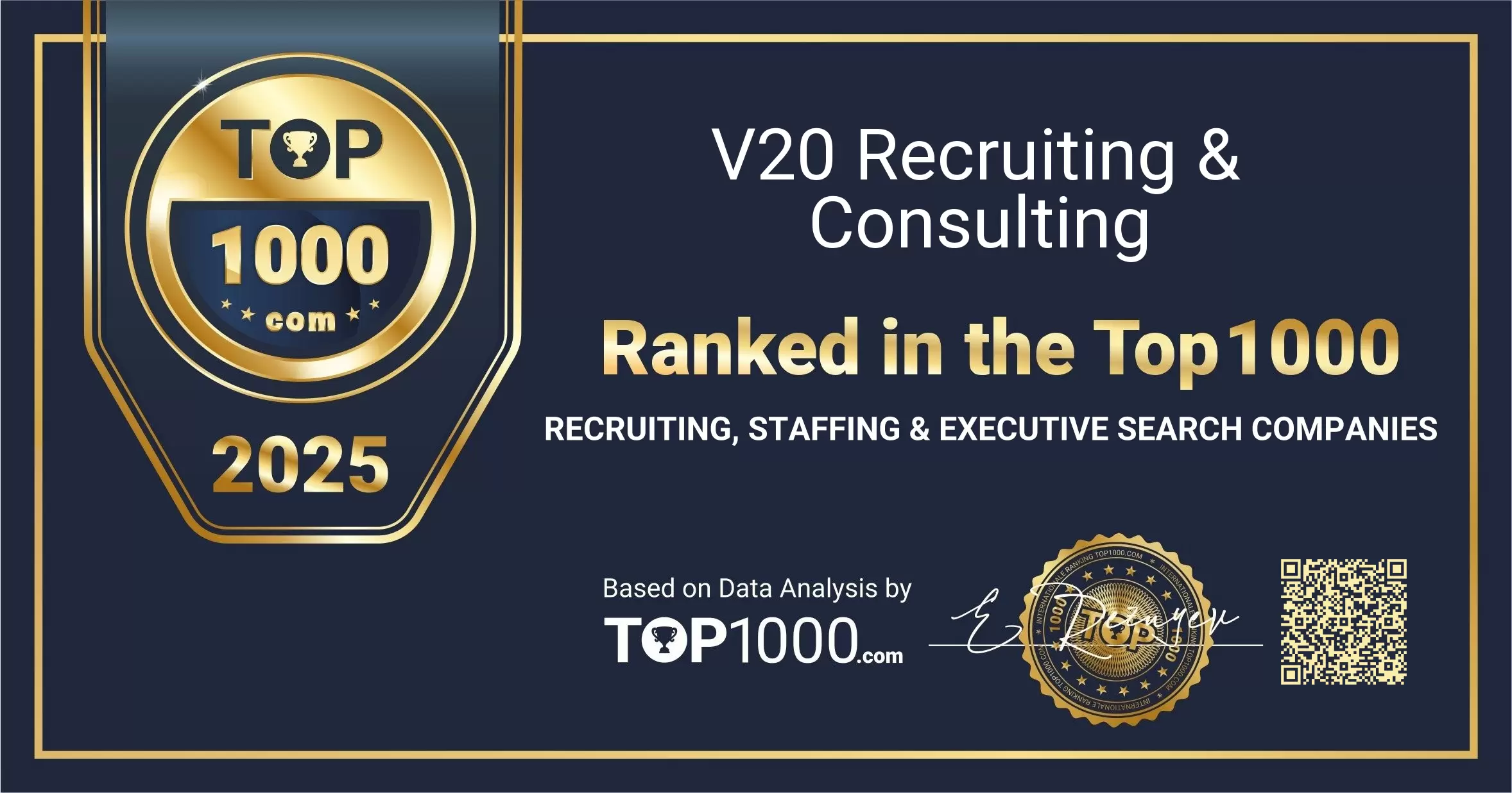 Earning a place among the Top 1000 Recruiting, Staffing & Executive Search Companies reflects strong visibility and trust from both employers and candidates. This recognition celebrates the sustained effort of V20 Recruiting & Consulting to support organisations with high-quality talent solutions and to guide professionals through key career moves.