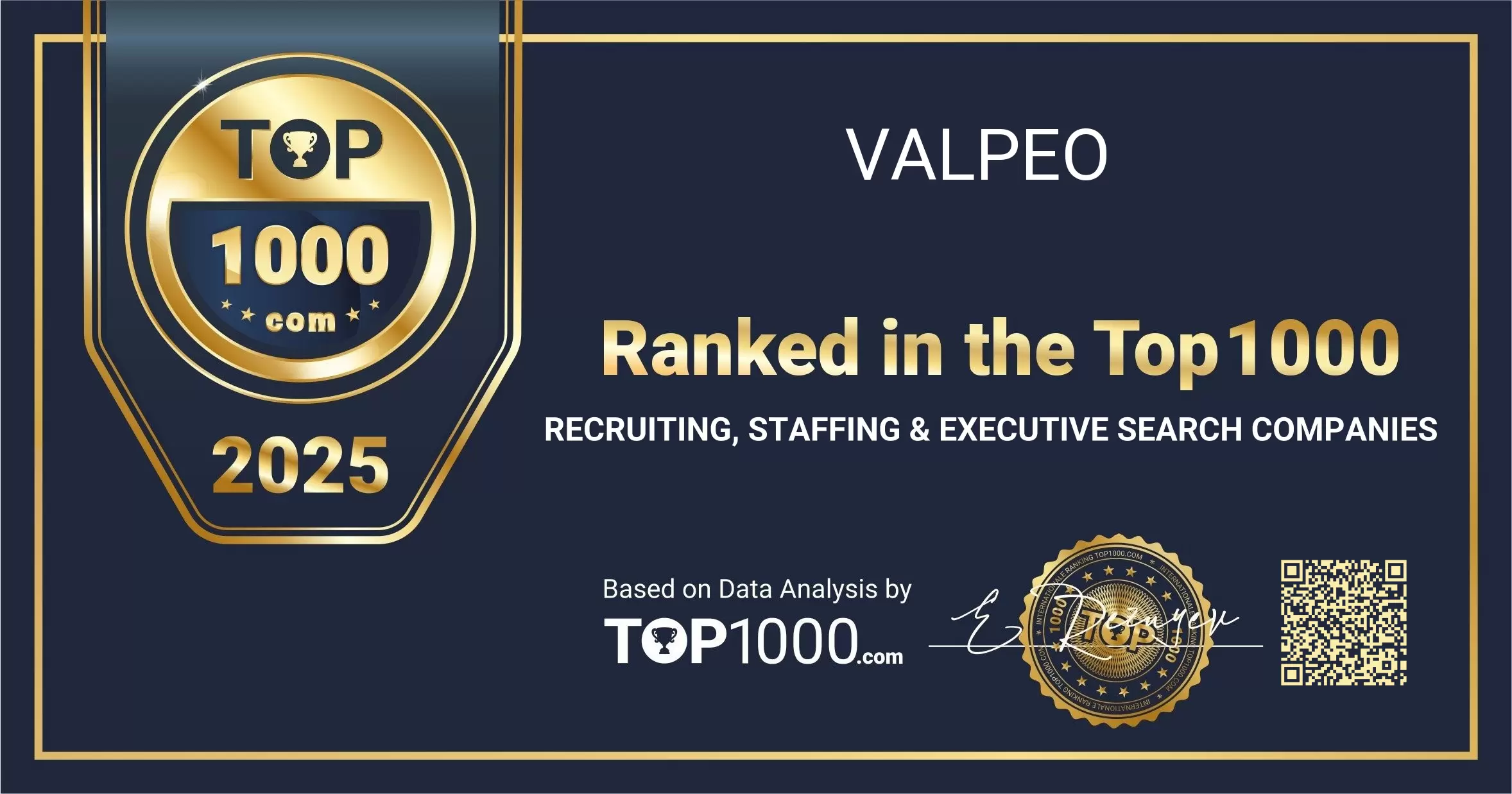 Earning a place among the Top 1000 Recruiting, Staffing & Executive Search Companies reflects strong visibility and trust from both employers and candidates. This recognition celebrates the sustained effort of VALPEO to support organisations with high-quality talent solutions and to guide professionals through key career moves.